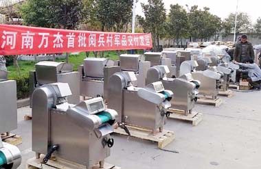 近日,河南萬杰食品機械有限公司排列整齊的食品機械準備裝車,發往“中國人民抗日戰爭暨世界反法西斯戰爭勝利70周年閱兵”部隊駐地。